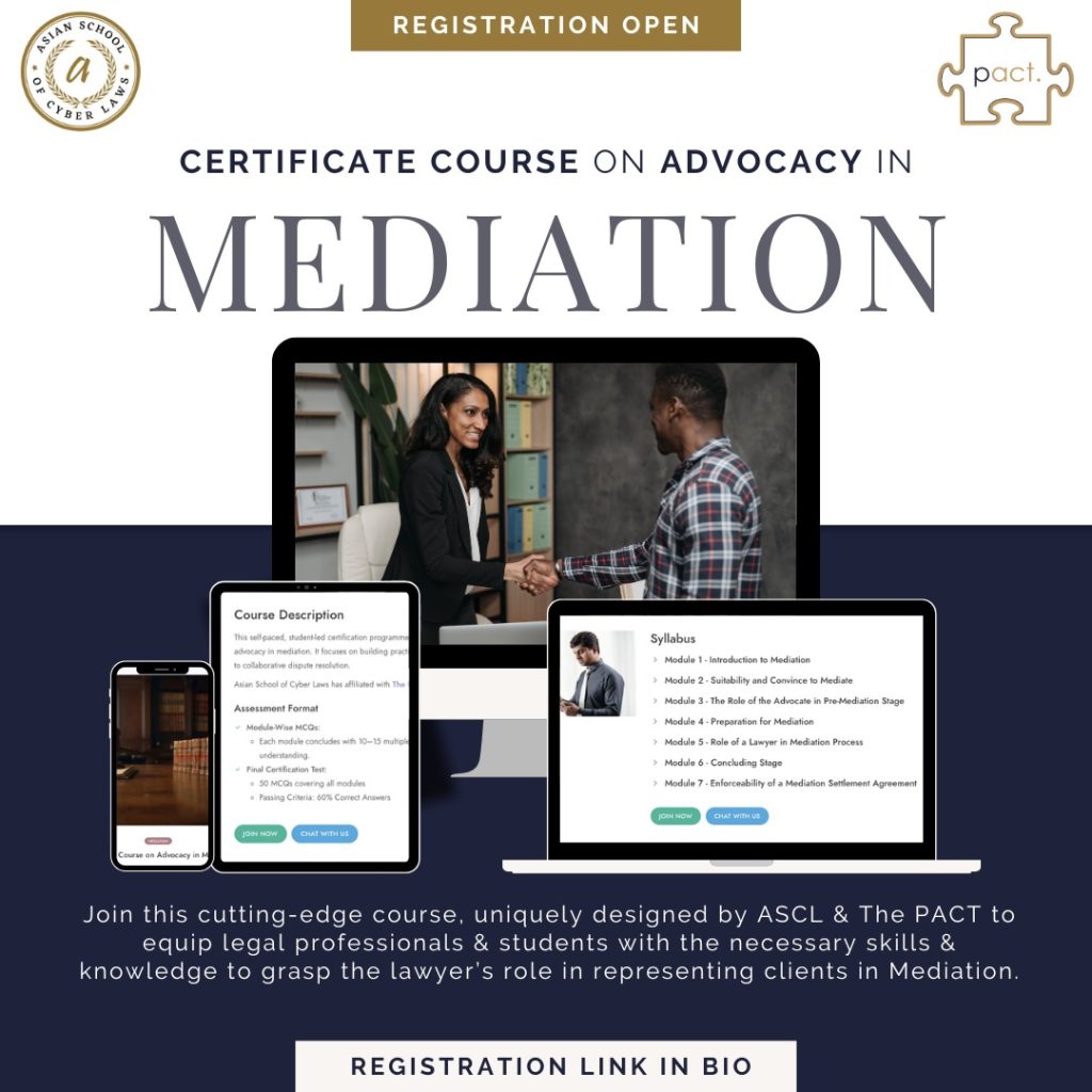The Asian School of Cyber Laws (ASCL) and The PACT is proud to announce the launch of their highly anticipated Certificate Course on Advocacy in Mediation – a uniquely designed and delivered virtual learning course in India, aimed at transforming legal practice in the field of Alternative Dispute Resolution (ADR). This cutting-edge course is designed to provide legal professionals with the skills and knowledge necessary to grasp the lawyer’s role in representing clients in Mediation.