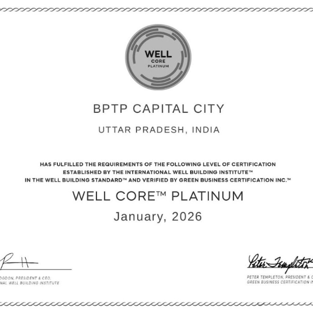 BPTP Capital City, developed by BPTP, one of North India’s leading real estate developers, has been awarded the WELL Core Platinum Certification, the highest level under the globally recognised WELL Building Standard. This achievement marks a significant milestone in the project’s sustainability roadmap and reinforces its commitment to people-first, wellness-driven design.