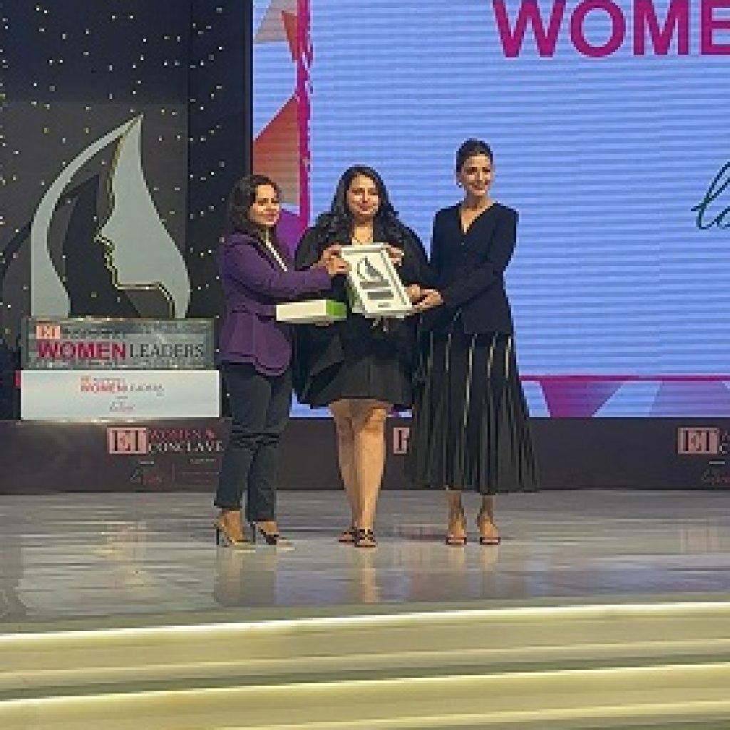 Ms. Tanvi Tiwari (L) and Ms. Prerna Sharma (C) receive the award from Bollywood Actress Sonali Bendre at the Economic Times Women Conclave 2025