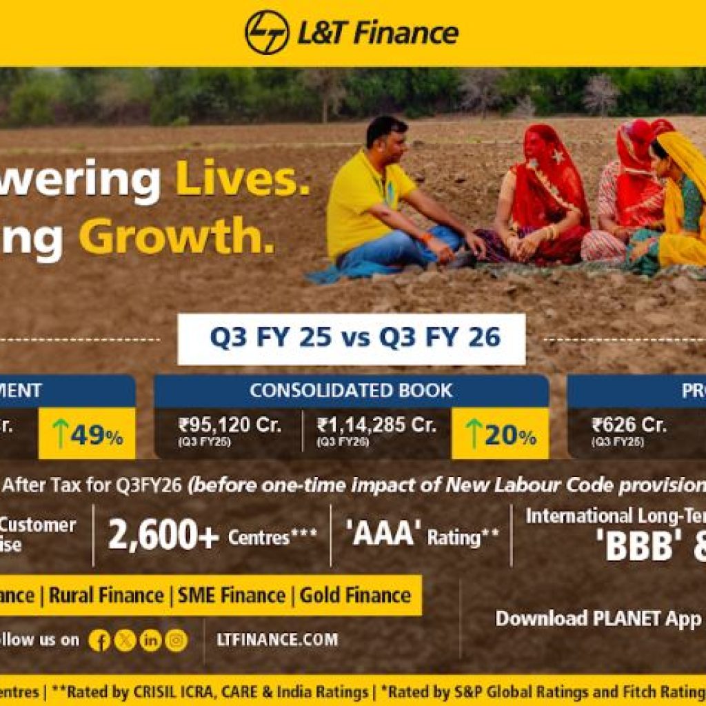 L&T Finance Ltd., formerly known as L&T Finance Holdings Ltd. (LTF), one of the leading Non-Banking Financial Companies (NBFCs) in India, has recorded its highest ever core Profit After Tax (PAT) of Rs. 760 Crore (before one-time impact of New Labour Code provision), up 21% YoY (Year-on-Year) in the third quarter ended December 31, 2025 (Q3FY26). PAT after one-time impact of New Labour Code stands at Rs. 739 Crore, up 18% in Q3FY26. During the quarter, the retail book size reached Rs. 1,11,990 Crore, up 21% YoY. The consolidated loan book grew by 20% YoY to Rs. 1,14,285 Crore. The Company has recorded the highest ever quarterly retail disbursement of Rs. 22,701 Crore for the third quarter ended December 31, 2025, up 49% YoY. The Company also recorded all-time high disbursements in Two-wheeler Finance at Rs. 3,217 Crore and Farmer Finance at Rs. 2,783 Crore growing 33% YoY and 12% YoY, respectively. Retailisation stood at 98% of overall book as on December 31, 2025.