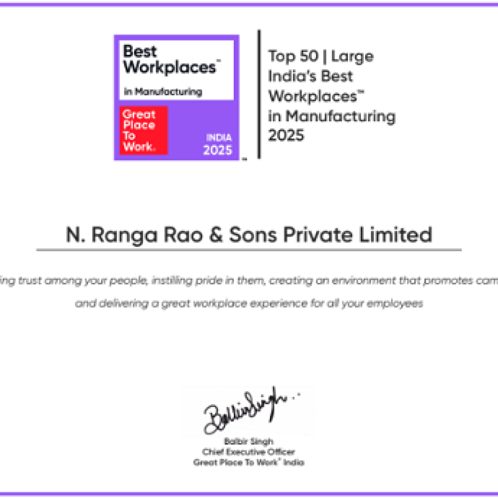 N Ranga Rao and Sons has been awarded as one of Indias Best Workplaces in Manufacturing for the third consecutive year