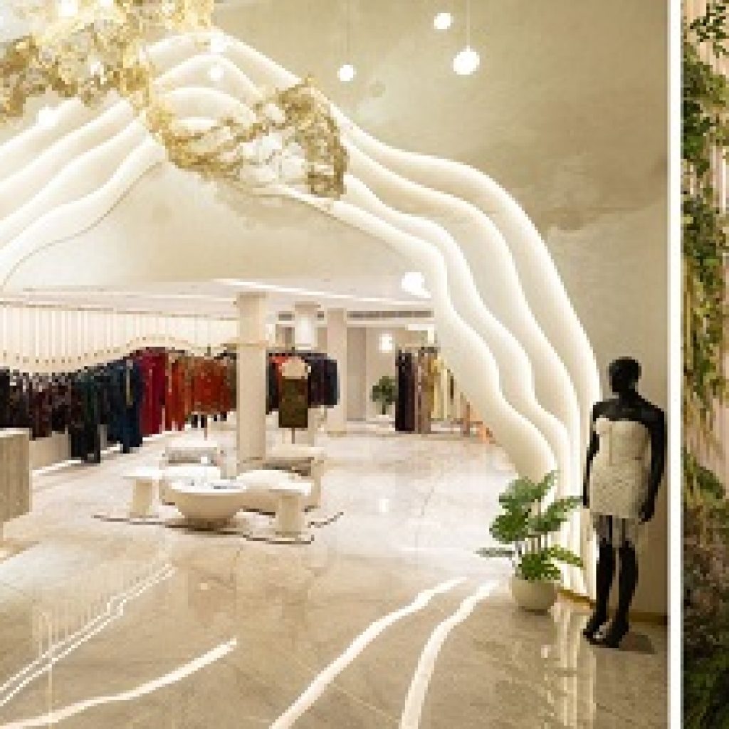 The store’s interiors are shaped by ‘The Tale of Two Arches‘, a concept that explores the duality between tradition and evolution. Tall arched windows, a double-height ceiling, and S-shaped curves inspired by Hogarth’s “line of beauty” define the space. Rope-draped hangers, layered textures, and a handcrafted metal mesh chandelier create structure and softness in equal measure. Each element is built to echo the signature cording seen in Nirmooha’s garments.