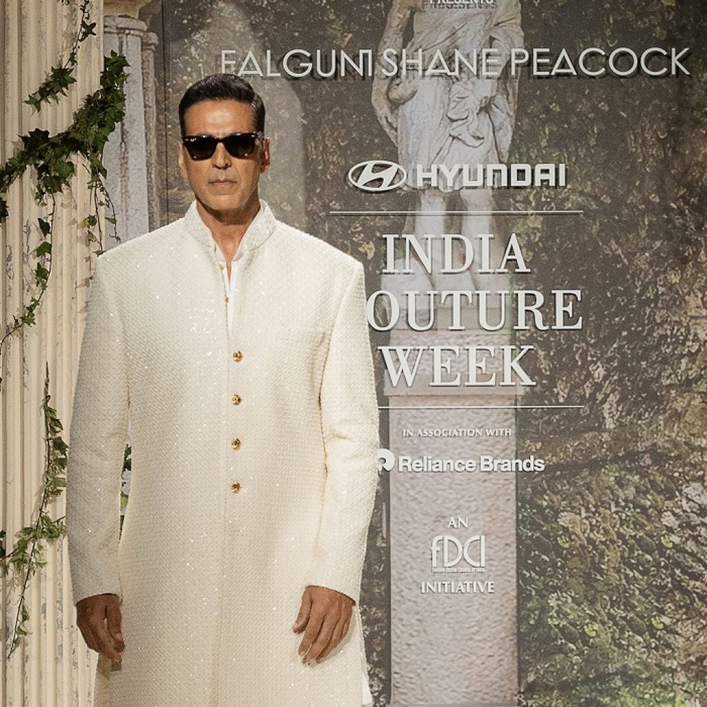 Known for dressing global icons and redefining couture with futuristic flair, Falguni Shane Peacock unveiled a collection that blurred the lines between fantasy and fashion. Inspired by the opulence of Indian maharajas and maharanis, the collection reimagined royal heritage with modern silhouettes, rich embroidery, and intricate detailing – exuding grandeur, drama, and theatrical finesse. Bollywood icon Akshay Kumar brought star power to the runway in an ivory bandhgala, paired with black sunglasses – a look that evoked princely elegance and effortless charisma.