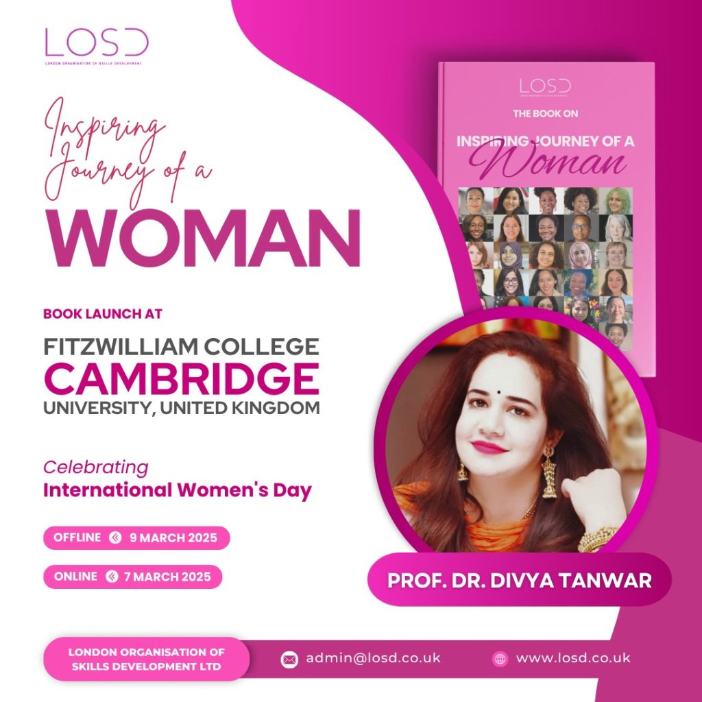 Renowned academician, cybersecurity expert, and social activist Prof. (Dr.) Divya Tanwar has been invited as a distinguished guest at the book launch of ‘Inspiring Journey of a Woman’ at Fitzwilliam College, Cambridge University, United Kingdom. The event, organized by the London Organisation of Skills Development Ltd (LOSD), will take place on March 9, 2025 (offline) and March 7, 2025 (online) in celebration of International Women’s Day.