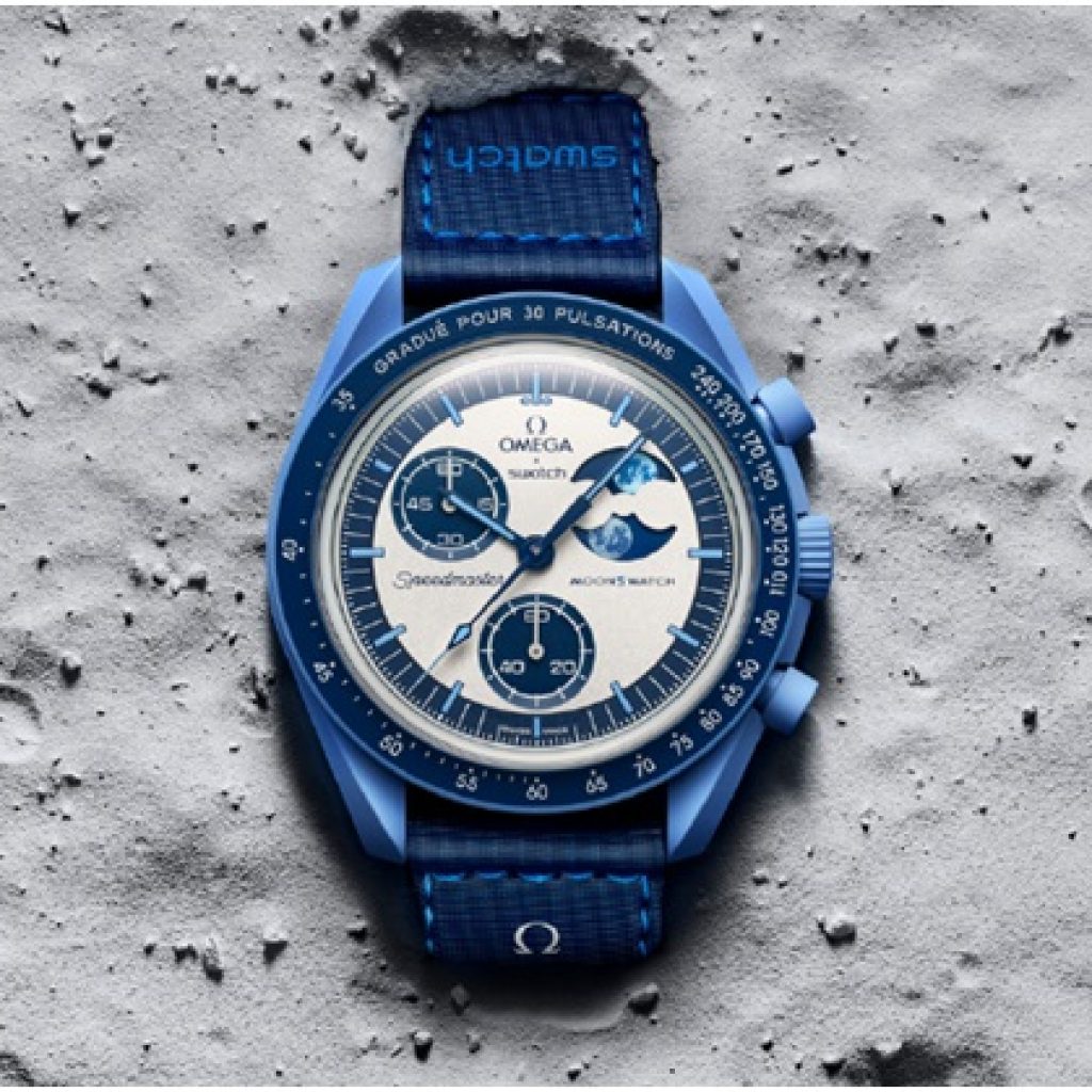 Dial: blue and silver-opaline, featuring the OMEGA X Swatch logo and the iconic Speedmaster and MoonSwatch logos, recessed subdials, hour markers with Grade A Super-LumiNova (blue emission). Moon phase indicator with silver-opaline mask and blue moon phase disc featuring an oversized full moon. Secret detail in UV ink (blue emission)