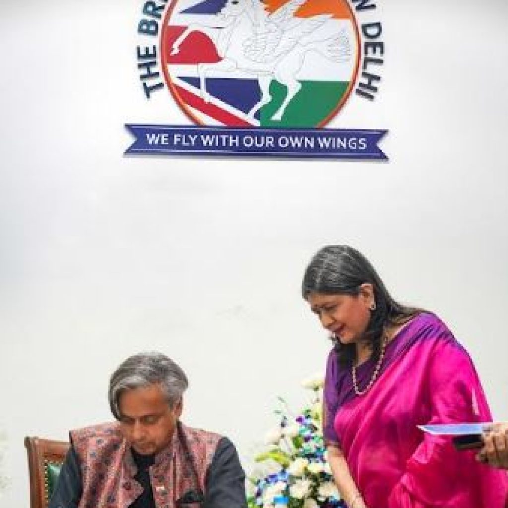Dr Shashi Tharoor with Vanita Upal OBE, Director of The British School New Delhi, penning a message for the school community at IB@20: Inspiring Futures